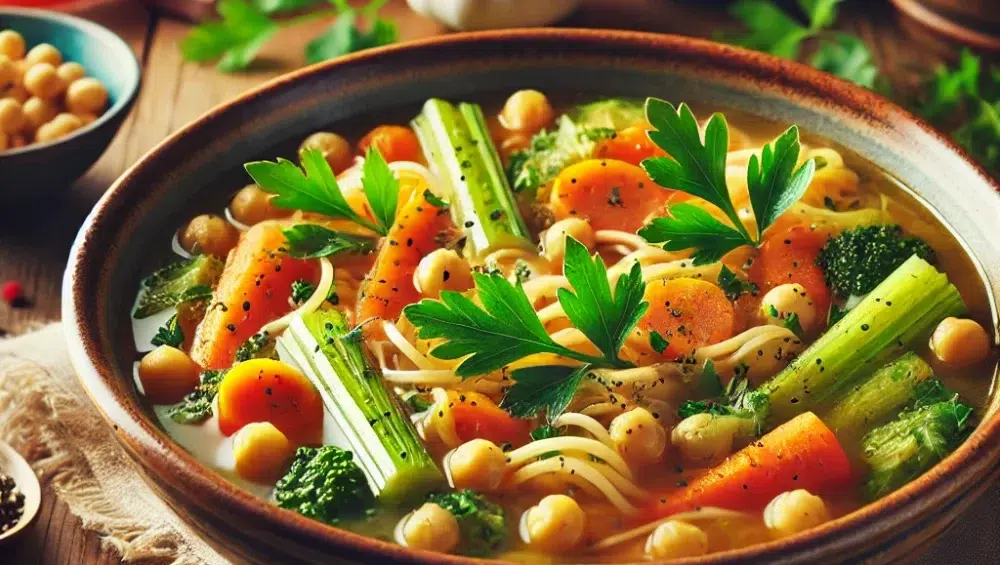 Aromatyczny rosół z mnóstwem warzyw to coś więcej niż zwykła zupa – to pełnowartościowy posiłek, który dostarcza energii, witamin i niepowtarzalnego smaku. Dodatek ciecierzycy sprawia, że danie staje się bardziej sycące i bogate w białko roślinne, co czyni je idealnym także dla osób dbających o zbilansowaną dietę. Warzywa nadają rosołowi lekkości, a odpowiednia kompozycja przypraw wzbogaca go o wyjątkowy aromat.