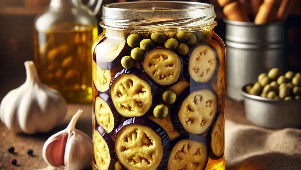 - Przygotowanie słoika: Następnego dnia bakłażany wkładamy do szklanego słoja do połowy jego wysokości, dodajemy płatki pokrojonego czosnku i oczyszczone z soli kapary.