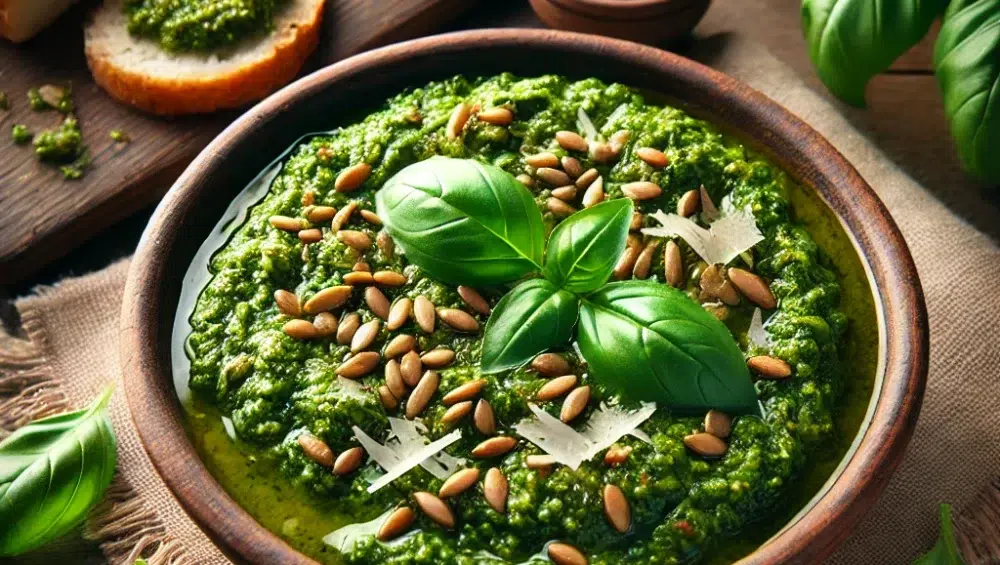 - Przechowywanie: Gotowe pesto przełóż do słoiczka i przechowuj w lodówce. Aby zachować jego świeżość na dłużej, wierzch pesto możesz skropić cienką warstwą oliwy, która zapobiegnie utlenianiu się składników. Pesto najlepiej spożyć w ciągu kilku dni, ale można je również zamrozić, co przedłuży jego trwałość.
