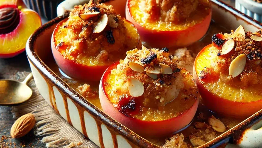 Brzoskwinie zapiekane z ciasteczkami amaretti to wykwintny deser, który łączy w sobie słodycz dojrzałych owoców z chrupiącą teksturą i migdałowym aromatem ciasteczek. Dodatek likieru Amaretto dodatkowo podkreśla głębię smaku, czyniąc ten deser idealnym wyborem na zakończenie wyjątkowego posiłku. Jest to propozycja zarówno na eleganckie przyjęcia, jak i na codzienną ucztę dla podniebienia.