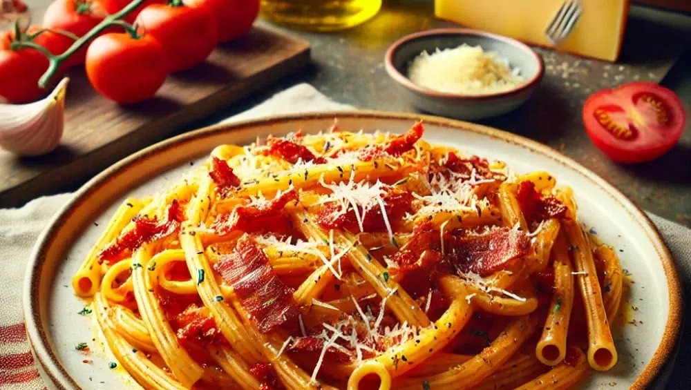 Amatriciana pierwotnie była przygotowywana bez pomidorów i nosiła nazwę Pasta alla Gricia. Pasterze mieszkający w okolicach Amatrice zabierali ze sobą guanciale, ser Pecorino oraz suszony makaron na wyprawy w góry, aby przygotować sycący posiłek. Dopiero pod koniec XVIII wieku do przepisu dodano pomidory, tworząc nową wersję tego klasycznego dania. Dziś Bucatini all’ Amatriciana jest jednym z najbardziej rozpoznawalnych włoskich dań na świecie.