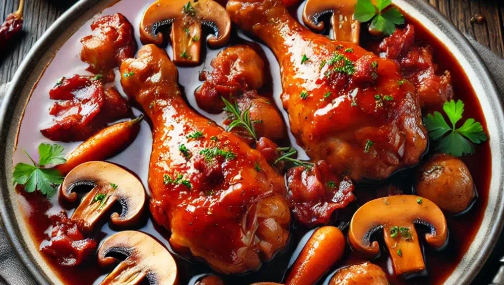 Coq au vin to klasyczne, a zarazem wyjątkowo eleganckie danie, które zachwyca głębokim smakiem i aromatem. Długie duszenie kurczaka w czerwonym winie pozwala uzyskać delikatne, rozpływające się w ustach mięso oraz gęsty, bogaty sos pełen aromatycznych przypraw. To danie idealne na specjalne okazje lub niedzielny obiad, który przeniesie Twoich gości prosto do serca Francji.