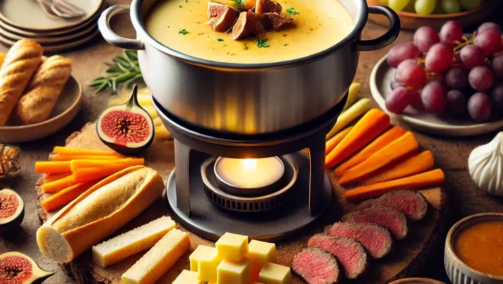 Fondue podajemy w garnku na podgrzewaczu, aby ser cały czas był ciepły i płynny. Na talerzach układamy pieczywo, owoce, warzywa oraz kawałki mięsa, które będą zanurzane w roztopionym serze. Fondue najlepiej smakuje w towarzystwie chrupiącego pieczywa i świeżych owoców, które świetnie kontrastują z kremową konsystencją serów.