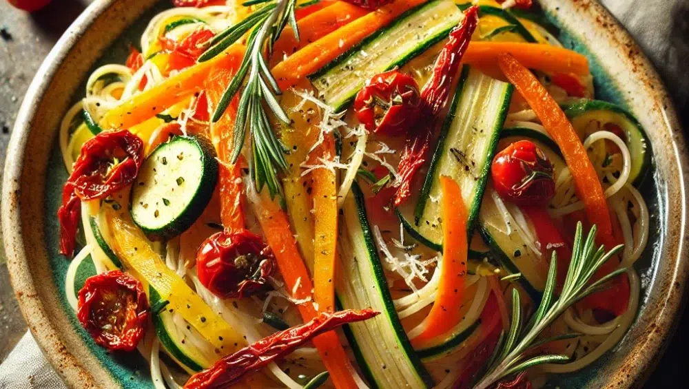 Spaghetti z warzywami to lekkie i pełne smaku danie, które łączy włoski charakter z bogactwem sezonowych warzyw. Kolorowe paski marchewki, cukinii i papryki nie tylko pięknie się prezentują na talerzu, ale również dostarczają mnóstwo witamin i minerałów. Dodatek suszonych pomidorów marynowanych w oliwie wzbogaca całość o delikatnie słodki i wyrazisty smak, natomiast olej sezamowy nadaje potrawie wyjątkowy, lekko orzechowy aromat. To szybkie danie, które można przygotować zarówno na codzienny obiad, jak i na wyjątkowe spotkania z rodziną czy przyjaciółmi.
