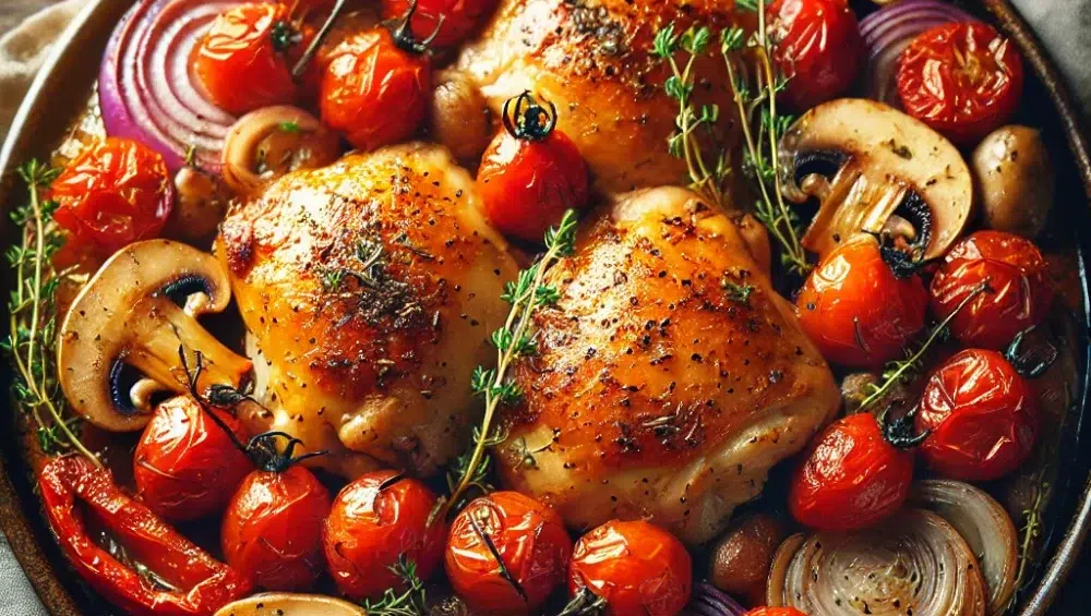 Kurczak pieczony z pomidorami to klasyczne danie, które łączy delikatne mięso z bogatym smakiem pieczonych warzyw. Dzięki dodatkowi świeżego i suszonego tymianku, potrawa nabiera wyrazistości i intensywnego aromatu, który idealnie komponuje się z soczystymi pomidorami, chrupiącą papryką i pieczarkami. Jest to idealne danie na rodzinny obiad, które nie wymaga dużego nakładu pracy, ale zachwyca bogactwem smaków. Przepis ten świetnie sprawdzi się zarówno w codziennym menu, jak i na specjalne okazje.