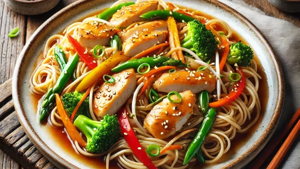 Kurczaka z warzywami podajemy z porcją makaronu ryżowego. Danie dekorujemy świeżymi kiełkami fasoli mung oraz posiekanym szczypiorkiem, które dodadzą świeżości i koloru. Całość najlepiej smakuje podana od razu po przygotowaniu, gdy makaron i warzywa są jeszcze ciepłe i aromatyczne.