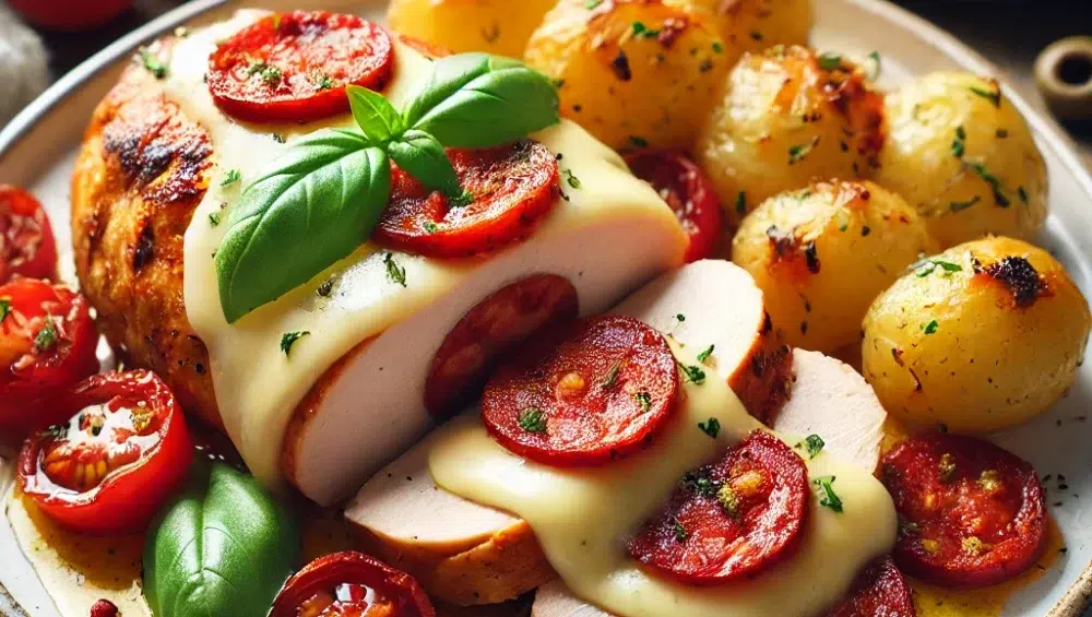 Kurczak z Chorizo i serem Manchego to wyjątkowe danie, które łączy hiszpańskie smaki w soczystej, zapiekanej piersi z kurczaka. Delikatne mięso, aromatyczna kiełbasa Chorizo, intensywny ser Manchego i świeża salsa z pomidorów i oliwek sprawiają, że ten przepis to prawdziwa uczta dla podniebienia. Do tego młode ziemniaki jako klasyczny dodatek, który idealnie uzupełnia całość. Sprawdź, jak krok po kroku przygotować to smaczne danie.
