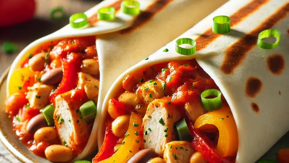 6. Składanie tortilli: Każdy placek tortilli wypełnij przygotowanym farszem z kurczaka, warzyw i fasoli. Zawiń placek w formę rulonu, a na wierzch posyp posiekanym szczypiorkiem (zieloną częścią cebuli dymki). Jeśli chcesz, aby tortilla była bardziej chrupiąca, możesz ją delikatnie opiec w piekarniku lub na patelni grillowej.