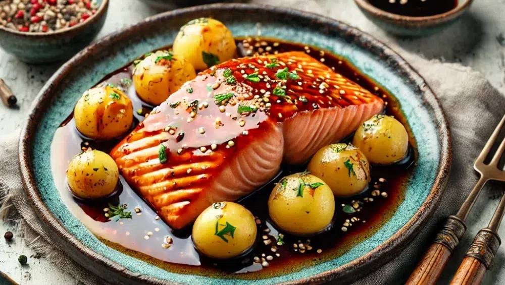 Gotowego łososia podajemy na talerzu, najlepiej z dodatkiem młodych, gotowanych ziemniaków, które doskonale komponują się z orientalnymi smakami ryby. Można także dodać świeżą sałatkę z zieleniny lub grillowane warzywa, aby uzupełnić danie o lekkość i chrupkość.