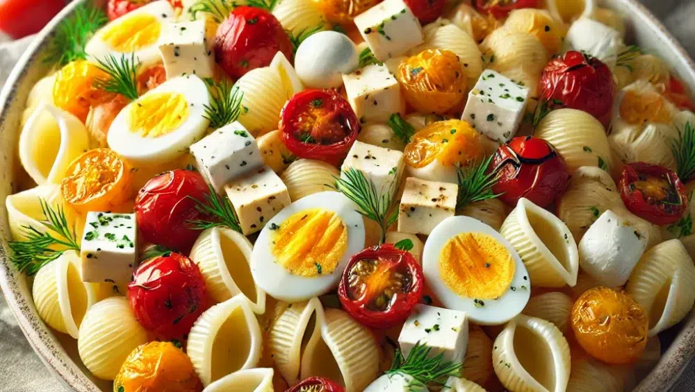 Muszelkowa sałatka z trzema serami i pieczonymi pomidorami to prawdziwa uczta dla miłośników różnorodnych smaków. Połączenie trzech rodzajów sera – delikatnej mini mozzarelli, słonej fety i kremowej goudy – z pieczonymi pomidorami nadaje tej sałatce wyjątkowy charakter. Dodatek ugotowanych na twardo jajek oraz lekkiego, cytrynowego dressingu sprawia, że to danie jest pełne smaku, a jednocześnie lekkie i idealne na każdą porę dnia. To świetna propozycja na lunch, kolację lub jako dodatek do większego posiłku.