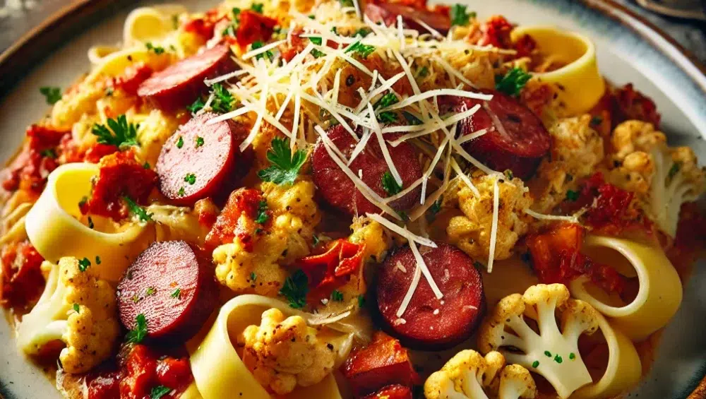 Makaron pappardelle to szerokie wstążki, które doskonale nadają się do cięższych sosów i gęstych dodatków. W połączeniu z delikatnym kalafiorem, aromatycznym czerwonym winem i soczystymi pomidorami, tworzy danie, które zaskakuje swoją głębią smaku i jednocześnie prostotą przygotowania. Dodatek kiełbasy nadaje potrawie charakteru, a natka pietruszki wprowadza świeżość. To idealne danie na rodzinny obiad lub elegancką kolację, które z pewnością zachwyci Twoich gości. Pappardelle z kalafiorem i czerwonym winem to wyjątkowe połączenie włoskich tradycji z nutą kreatywności w kuchni.