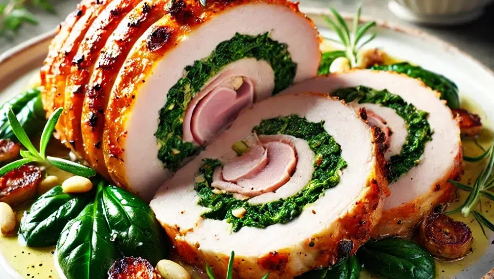 Pieczeń z indyka nadziewana szpinakiem to danie, które z pewnością zachwyci każdego gościa. Soczyste mięso, aromatyczny farsz i delikatna nuta rozmarynu sprawiają, że jest to propozycja idealna na elegancki obiad lub kolację. Dodatek orzeszków piniowych i parmezanu nadaje potrawie wyrafinowanego smaku, a białe wino zapewnia wyjątkową głębię. To danie, które z pewnością na długo zostanie w pamięci każdego, kto spróbuje!