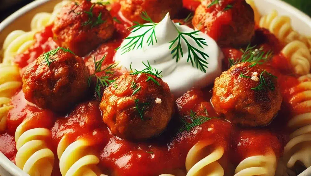 - Podawanie: Na talerz wyłóż ugotowany makaron, na wierzch połóż pulpeciki z sosem. Całość polej śmietaną kwaśną i posyp świeżym koperkiem.