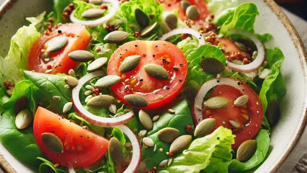 - Łączenie składników: Na przygotowaną roszponkę ułóż pokrojonego pomidora i cebulę. Następnie posyp całość uprażonymi pestkami dyni, które wzbogacą sałatkę o chrupiący element.