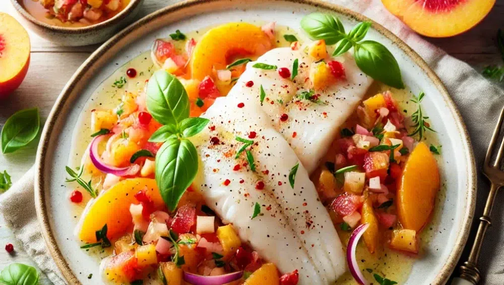 Podawaj rybę na talerzu z dużą porcją salsy brzoskwiniowej. Połączenie soczystych owoców, ziół i lekkiej ryby sprawia, że danie jest nie tylko smaczne, ale i zdrowe. Możesz dodatkowo udekorować potrawę listkami świeżej bazylii lub rozmarynu, co nada jej jeszcze bardziej apetycznego wyglądu.