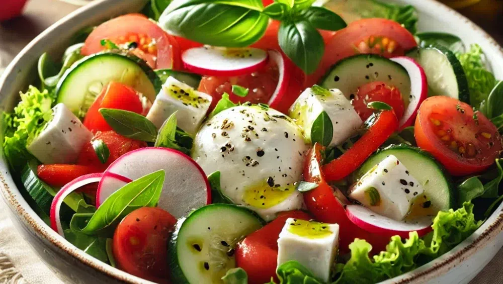 - Mieszanie składników: Do dużej miski wrzucamy przygotowane warzywa, dodajemy kiełki rzodkiewki i pokrojoną mozzarellę.