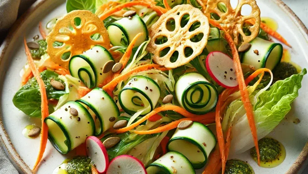 Sałatki to doskonały sposób na szybki i zdrowy posiłek, a jednocześnie idealna okazja do eksperymentowania z różnorodnymi składnikami. Sałatka z cukinii i marchewki to danie, które zachwyca swoją lekkością, świeżością oraz bogactwem smaków i tekstur. Wprowadzenie chrupiących chipsów z korzenia lotosu oraz kremowego pesto bazyliowego nadaje sałatce wyjątkowego charakteru. To przepis, który świetnie sprawdzi się zarówno jako lekki lunch, jak i dodatek do obiadu.
