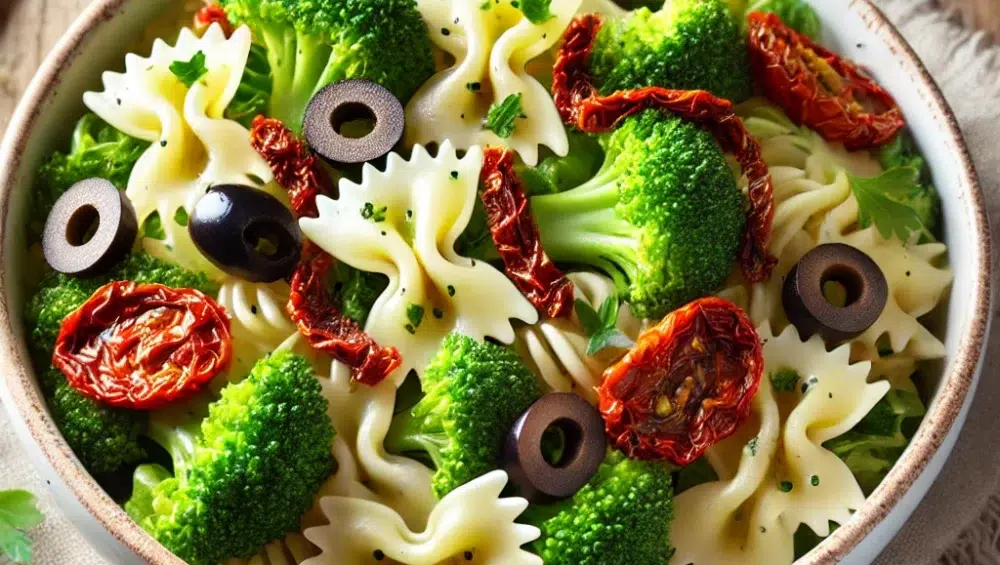 - Mieszanie składników: W dużej misce połącz ostudzony makaron, brokuły, suszone pomidory oraz sos. Wszystko dokładnie wymieszaj.