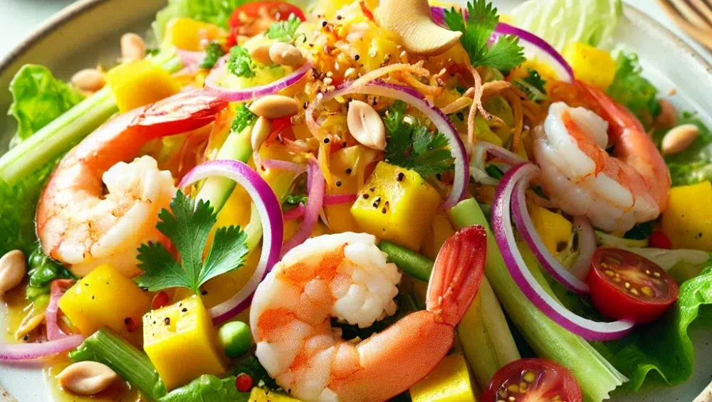 Szukasz pomysłu na lekką, ale jednocześnie pełną smaku i aromatu sałatkę? Sałatka z mango, krewetkami i imbirem to idealna propozycja na szybki lunch, lekką kolację lub elegancką przystawkę na spotkanie z przyjaciółmi. Ta egzotyczna kombinacja słodkiego mango, delikatnych krewetek i wyrazistego imbiru zaskoczy cię swoją różnorodnością smaków. Świeżość warzyw, aromatyczny sos na bazie mango oraz lekka pikanteria imbiru i kolendry sprawiają, że każda porcja tej sałatki jest prawdziwą eksplozją smaków.