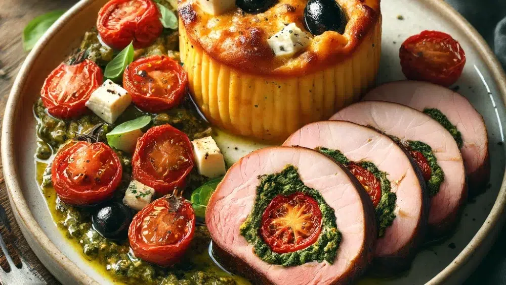 Schab faszerowany pesto z suszonych pomidorów to danie, które łączy klasyczne smaki mięsa z nutą śródziemnomorskich aromatów. Połączenie delikatnego schabu z wyrazistym pesto na bazie suszonych pomidorów, pestek dyni oraz szałwii tworzy bogaty smak, który jest podkreślony przez dodatek szynki szwarcwaldzkiej, nadającej chrupiącej tekstury. Towarzyszący temu clafoutis – francuska zapiekanka – z pomidorkami koktajlowymi, oliwkami i serem feta, to idealny akcent warzywny, który uzupełnia całe danie, dodając lekkości i świeżości.
