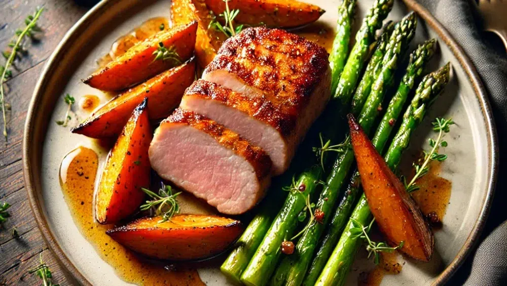 Schab iberyjski to mięso wyjątkowe, znane ze swojej delikatności, soczystości i intensywnego smaku. Połączenie go z karmelizowanymi batatami i zielonymi szparagami tworzy danie, które zachwyci nawet najbardziej wymagające podniebienia. W tym przepisie łączymy różnorodne tekstury i smaki: miękkie, słodkawe bataty, chrupiące szparagi i idealnie przyrządzony, aromatyczny schab. To wykwintne danie, które świetnie sprawdzi się na specjalne okazje, ale również w domowym zaciszu, kiedy chcemy przygotować coś wyjątkowego.