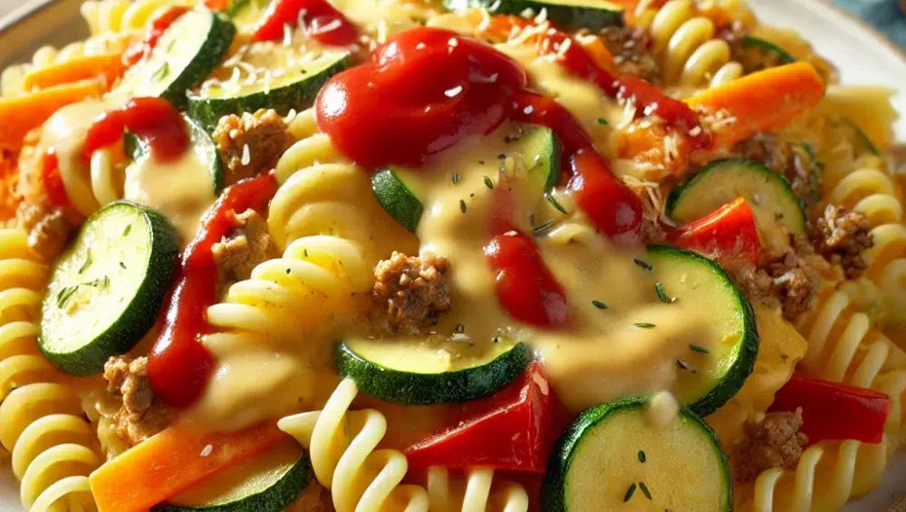- Dodanie sera i ketchupu: Do warzyw i mięsa dodaj starty ser żółty oraz ketchup pikantny. Mieszaj, aż ser się rozpuści i połączy z warzywami, tworząc gładki, kremowy sos. Ketchup nadaje daniu wyrazisty smak, a ser zapewnia przyjemną konsystencję.