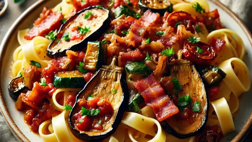 Tagliatelle z bakłażanem to danie, które doskonale łączy w sobie smakowe bogactwo prostych składników, takich jak delikatny bakłażan, chrupiący boczek i aromatyczny czosnek. Ten przepis to idealne połączenie świeżości warzyw z głębokim smakiem koncentratu pomidorowego i delikatnych, sprężystych wstążek makaronu. To idealna propozycja na szybki, sycący obiad lub kolację, która zachwyci miłośników włoskiej kuchni.