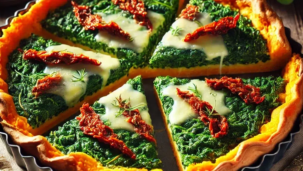 Tarta szpinakowa na spodzie z batatów to połączenie klasycznych, zdrowych składników w nowoczesnym wydaniu. Słodycz batatów, kremowe nadzienie szpinakowe z nutą pikantnych przypraw i suszonych pomidorów oraz aromatyczny ser grana padano tworzą harmonijną i zaskakującą kompozycję smaków. To idealna propozycja na lekki obiad, elegancką kolację lub zdrową przekąskę, którą pokochają zarówno wegetarianie, jak i miłośnicy kuchni pełnej smaku i wartości odżywczych.