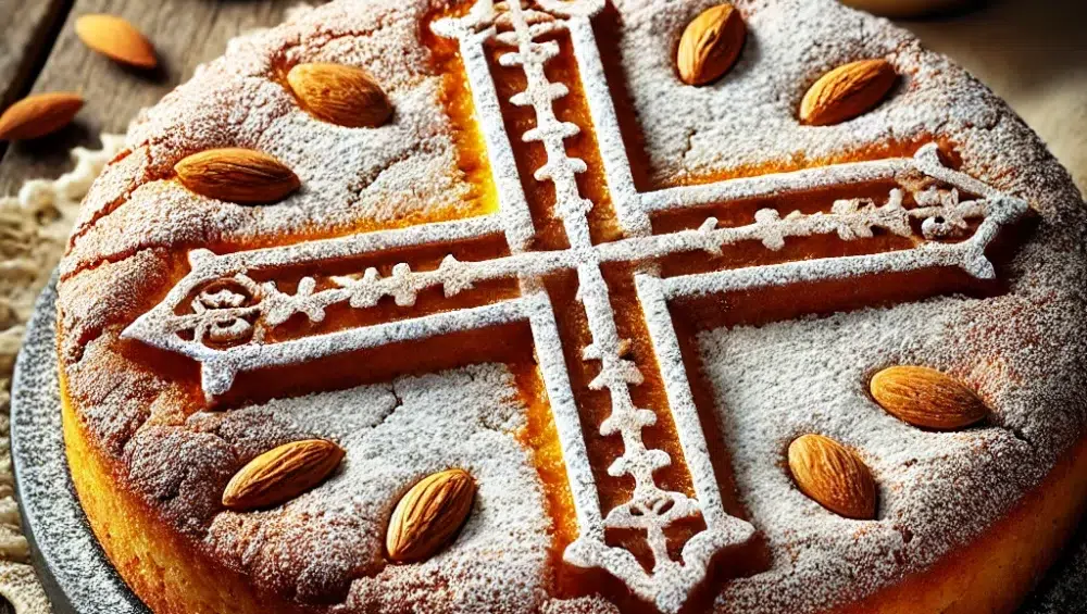 Torta de Santiago to tradycyjne hiszpańskie ciasto migdałowe pochodzące z Galicji, którego historia sięga średniowiecza. Jest to deser bez mąki, co czyni go doskonałą opcją dla osób na diecie bezglutenowej. Charakteryzuje się prostotą składników oraz głębią smaku, który łączy słodycz migdałów z cytrusową nutą cytryny i ciepłem cynamonu. Idealnie sprawdzi się jako słodkie zakończenie każdego posiłku.