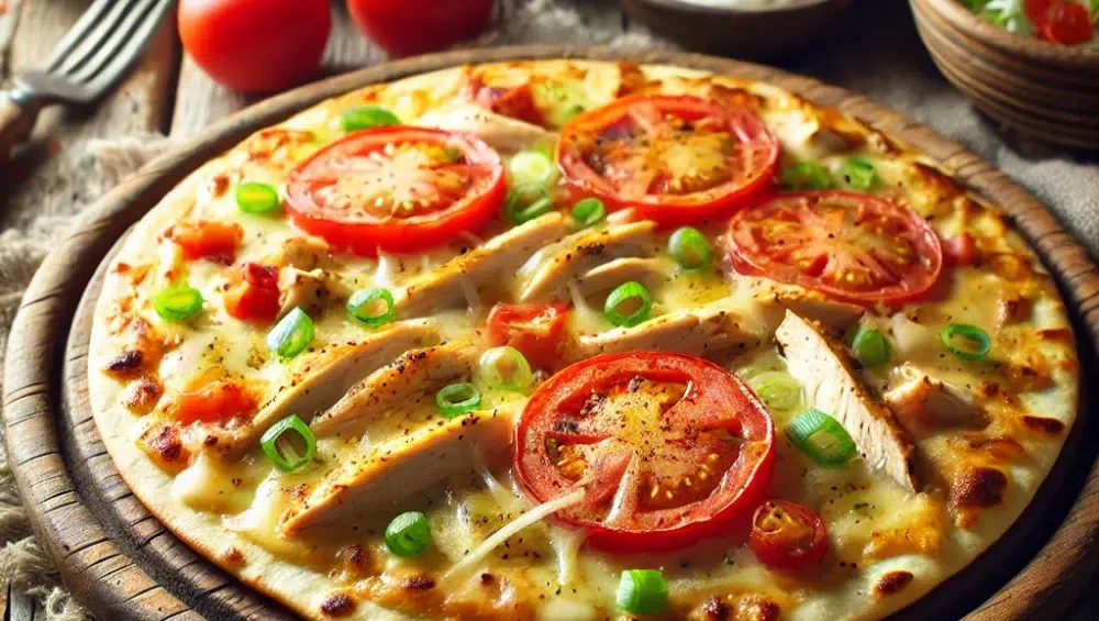 Na każdym placku ułóż plasterki pomidora, posiekaną cebulę dymkę wraz ze szczypiorkiem oraz kawałki usmażonego kurczaka. Wszystko delikatnie dopraw solą i pieprzem, a następnie posyp startym żółtym serem. Na koniec wierzch posyp odrobiną słodkiej papryki, która nada daniu dodatkowego koloru i aromatu.