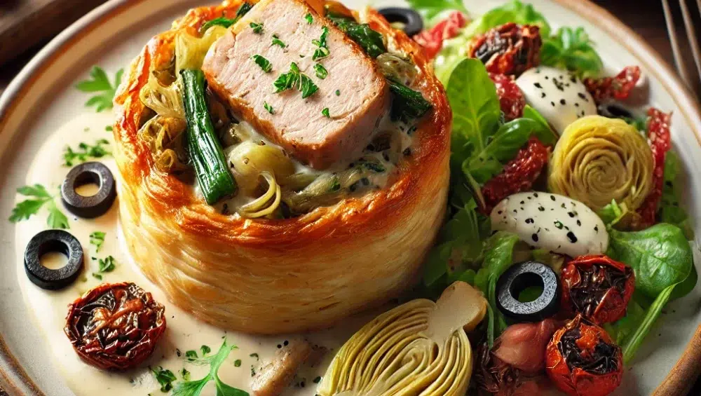 Vol-au-vent to klasyczna francuska przekąska, która zachwyca swoją lekkością i finezyjną formą. Te puste w środku „koszyczki” z ciasta francuskiego doskonale nadają się do napełniania różnymi farszami. W naszej wersji przygotowujemy je z delikatnym schabem, porem i aromatycznym sosem pieczarkowym. To danie świetnie komponuje się z lekką sałatką z karczochami, suszonymi pomidorami i oliwkami, co dodaje całości świeżości i wyrazistości. Vol-au-vent to idealna propozycja na elegancki obiad, którym zaskoczysz swoich gości, a jednocześnie nie wymaga skomplikowanych technik kulinarnych.
