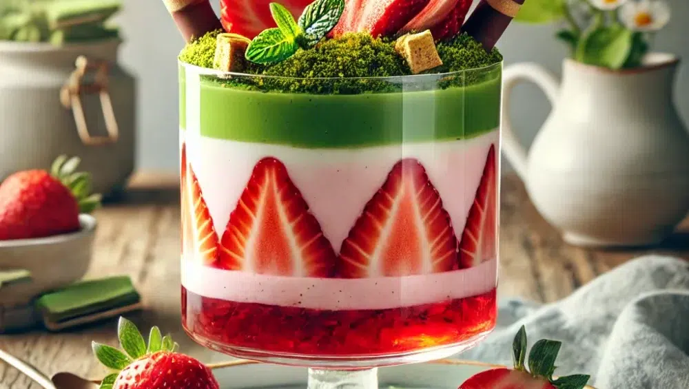 Deser „Fragola”, co po włosku oznacza truskawkę, to prawdziwa uczta dla zmysłów. Połączenie delikatnego musu truskawkowego, orzeźwiającej galaretki z zielonej herbaty oraz chrupiących biszkoptów sprawia, że ten deser nie tylko zachwyca smakiem, ale również wyglądem. To idealna propozycja na letnie spotkania, romantyczne kolacje czy uroczyste przyjęcia.