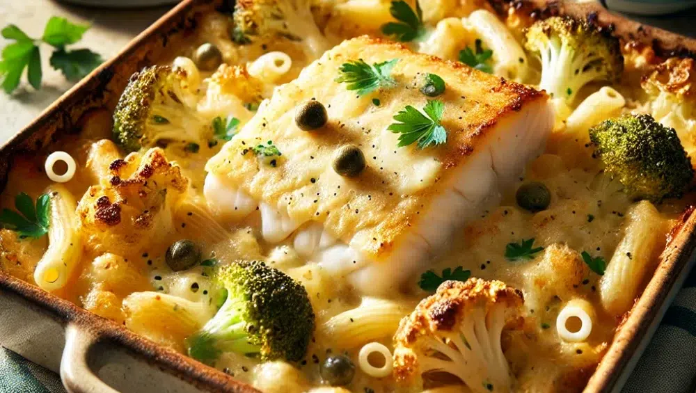 Zapiekanka z halibutem, makaronem i sosem mornay to danie, które łączy delikatność ryby z kremowym bogactwem sosu i chrupiącymi dodatkami. Wykwintna, ale jednocześnie łatwa w przygotowaniu, stanowi doskonały pomysł na wyjątkowy posiłek. Kalafior i makaron w połączeniu z aksamitnym sosem mornay oraz wyrazistą salsą z kaparów tworzą harmonijną kompozycję smaków, która na pewno zadowoli podniebienia Twoich gości.
